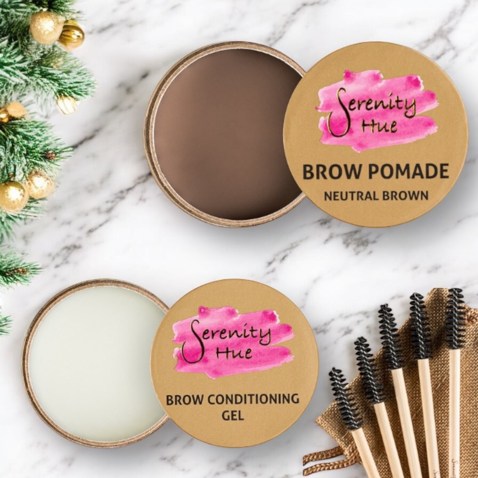 Unlock the secret to full, defined, and nourished brows with Serenity Hue's Brow Care Duo. This expertly crafted set includes our Brow Pomade Gel and Brow Conditioning Gel, designed to help you feed your brow with essential nourishment and create the ultimate power brow. Plus, enjoy a free pouch for storage and 5 spoolies for flawless application.