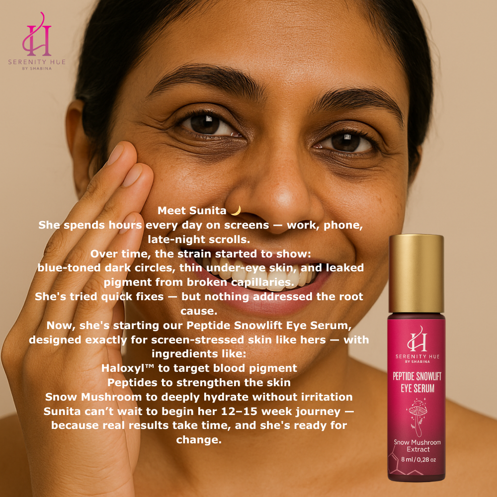 A high-performance under-eye serum powered by biotech peptides, snow mushroom, niacinamide, and plant extracts — all delivered via a cooling rollerball to target: